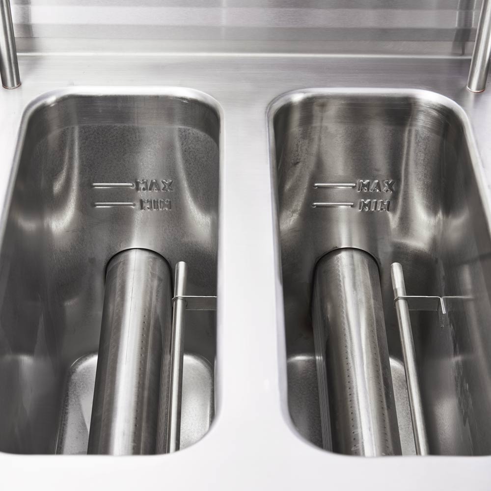 Sie lieben es knusprig? Frittieren Sie ganz klassisch Pommes, süße Gebäcke, Dekorationen oder probieren Sie neue Rezepte aus, mit der Fritteuse von Stalgast bekommen Sie Top-Resultate!Effiziente, langlebige Heizelemente aus Edelstahl bringen die gasbetriebene Fritteuse mit einer Leistung von 2x 6kW besonders schnell auf Temperatur und halten diese auch im Dauerbetrieb konstant.In den geräumigen Frittierkörben finden Ihre Lebensmittel ausreichend Platz, um allseitig gleichmäßig gebräunt zu frittieren.Zum Abtropfen haken Sie die handlichen Körbe einfach an der rückseitigen Aufhängung ein. Rückstände des Frittiergutes sammeln sich unterhalb der Heizelemente in der sog. Kaltzone. In diesem Bereich können die Rückstände nicht verbrennen und die Qualität Ihres Frittieröles bleibt länger erhalten.Das Gehäuse und der rückseitige, hohe Kamin sind aus pflegeleichtem, robustem Edelstahl gefertigt. Fettspritzer können leicht abgewischt werden und Ihre Fritteuse glänzt vor Sauberkeit. Ebenso einfach lassen sich die jeweils 7 Liter fassenden Becken entleeren und reinigen.Hinter der doppelten Edelstahltür mit Magnetschließer finden Sie das Ölablassventil und einen herausziehbaren Sammelbehälter mit Siebaufsatz für das gebrauchte Frittieröl. Daneben finden sich, übersichtlich und funktionell angeordnet, die An- und Ausschalter der Brenner, die Bedienknöpfe der Funkengeneratoren und das Sicherheitsthermostat.Die Fritteuse von Stalgast ist perfekt für den Einsatz in Ihrem Restaurant, Imbiss oder Großküche und reiht sich optimal in Ihre persönliche 700 ND-Kochstrecke ein oder findet seine Ausstellung als Einzelgerät.