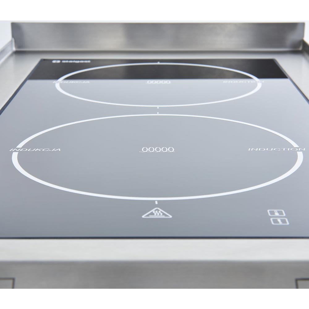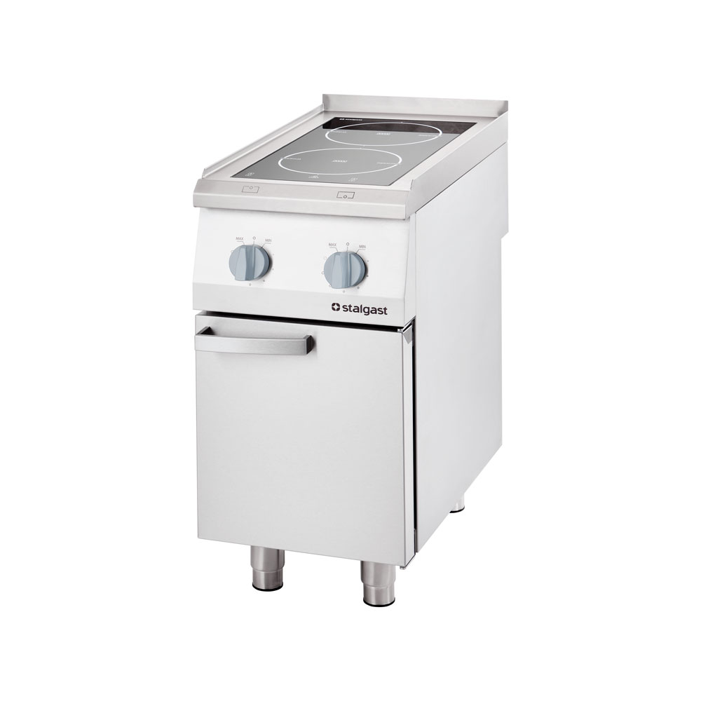 Kurze Aufheizzeit des Kochfeldes, unmittelbare Temperaturregulation, geringer Energieverbrauch, kaum Wärmeemission, schnelle Reinigung und niedrige Wartungskosten – die professionellen Induktionsherde von Stalgast vereinen viele unschlagbare Vorteile für Sie!Stalgast setzt bei der Induktion auf modernste Technik. Das pflegeleichte Kochfeld aus Glaskeramik beherbergt zwei Induktionsspulen mit 25 cm Durchmesser, die ein magnetisches Feld erzeugen. Dies nimmt der geeignete Topf auf und wandelt es in Wärme um.Sie können Ihr Kochgeschirr bis zu einer Größe von 32 cm beliebig auf dem Kochfeld platzieren und trotzdem sicher sein, dass Ihr Kochgut mit konstanter Wärmezufuhr erhitzt werden.Die von Ihnen gewählte Temperatur lässt sich schnell und direkt regulieren; selbst niedrige Temperaturen sind möglich und erlauben Ihnen z.B. das Schmelzen von Schokolade ohne Wasserbad. Dabei erhitzt sich nur der Topf, das umgebende Kochfeld bleibt kalt und keine Energie geht verloren. Das Kochfeld verfügt über eine Betriebs- und Restwärmeanzeige sowie eine digitale Anzeige der Temperaturstufe. Die Übergänge vom Kochfeld zum Rand sind fließend und erleichtern das Reinigen.Die Blende sowie die Bedienleiste sind leicht schräggestellt und lasergraviert für eine einfache, intuitive Bedienung und eine dauerhaft gute Lesbarkeit. Besonders vorteilhaft sind die Knebel in Edelstahloptik mit rutschfester, gummierter Griffzone für eine komfortable Bedienung.Unter dem Kochfeld ist ein großes Fach zum Verstauen von Küchenutensilien oder Vorräten. Die Tür mit Magnetverschluss und dem gekanteten, stylishen Griff sorgt für optische Ordnung und Schutz vor Verschmutzungen im Stauraum.Dieses Gerät aus hochwertigem Edelstahl kann als Einzelgerät oder als Teil einer Kochstrecke betrieben werden.