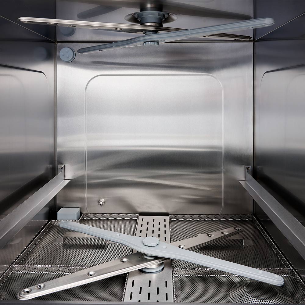 Die Stalgast-Spülmaschinen der Serie Aqua stehen für Effizienz, Reinheit, Zuverlässigkeit und Bedienkomfort.Dieses Modell ist für GN-1/1-Spülkörbe ausgelegt und eignet sich für Porzellan, Glas, Besteck und Küchenzubehör. Dank einer Einschubhöhe von 32 cm finden auch größere Töpfe oder Weizengläser problemlos Platz.Je nach Bedarf wählen Sie über die digitale Steuerung einen von drei Spülmodi für leichte bis hartnäckige Verschmutzungen aus. Die Spültemperatur liegt bei ca. 65°C. Die Wassertemperatur beim Klarspülen beträgt ca. 90°C - optimal für ein glanzvolles Ergebnis. Spül- und Klarspültemperatur sind auch manuell anpassbar.Zwei Wasch- und zwei Spülarme sorgen für eine gleichmäßige Reinigung, unterstützt durch rotierende Bewegungen nach neuesten technischen Standards. Die integrierten Dosierpumpen bemessen Reiniger und Klarspüler sparsam und bedarfsgerecht. Die Klarspülpumpe erhöht den Wasserdruck, was das Reinigungsergebnis maximiert.Nach dem Gebrauch entleert die Ablaufpumpe den Wassertank automatisch, das Flächensieb im Boden schützt die Pumpe vor Verunreinigungen.Wir empfehlen Ihnen, die Spülmaschine von einem Fachmann installieren zu lassen.