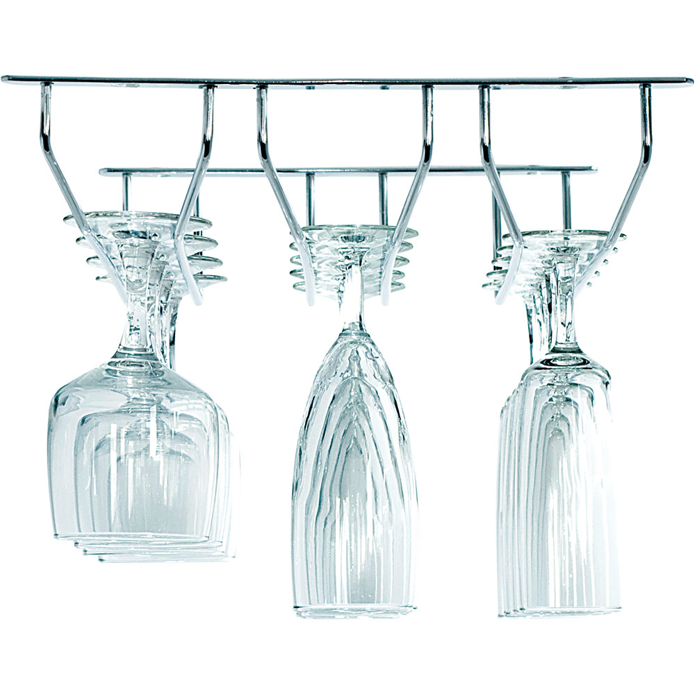Empfohlen zur sicheren, griffbereiten Aufbewahrung von Stielgläsern. Die Einschubbreite zwischen den runden Streben misst ca. 7 cm und bietet genügend Platz für Gläser mit einem großen Fuß. Die Gläserschienen können z.B. an der Decke oder an der Unterseite von Theken montiert werden.
