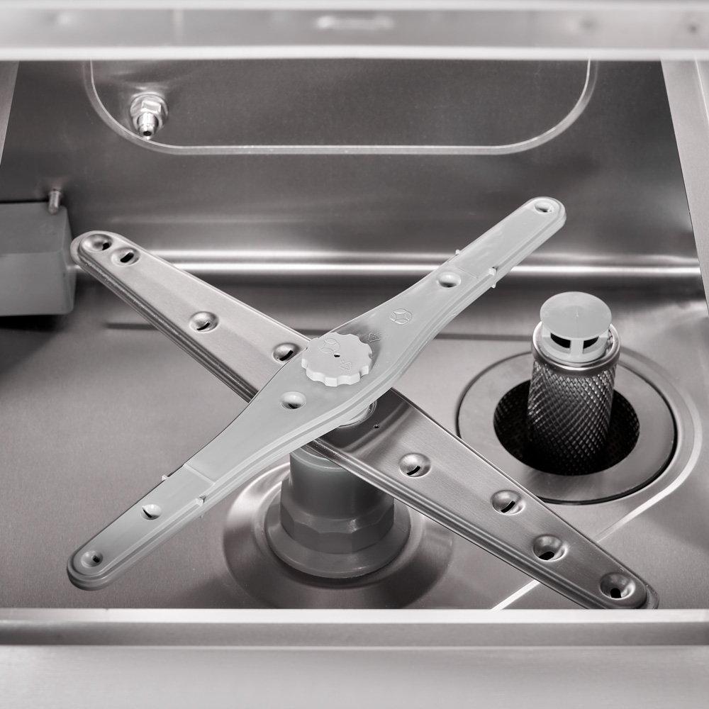 - 3 Wascharme (Edelstahl/Kunststoff), unten Wasch- und Spülarm, oben Spülarm