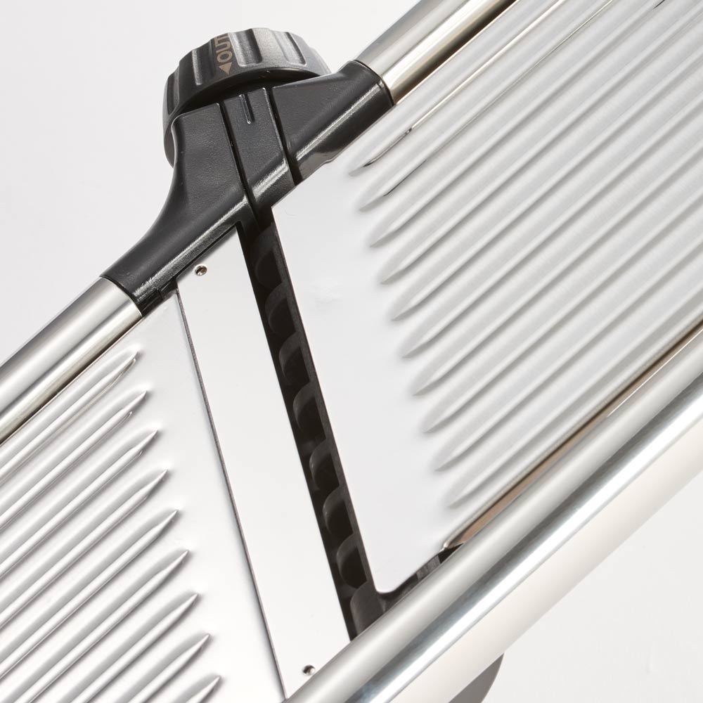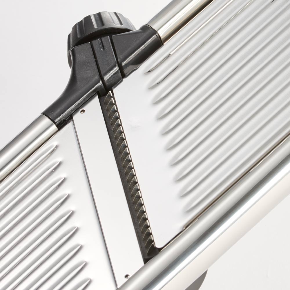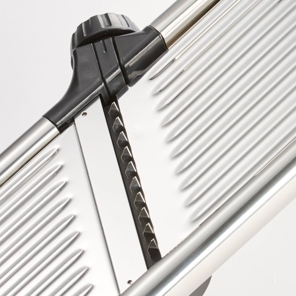 Mit der Mandoline läuft es wie geschnitten! Extra scharfe Klingen hobeln und schneiden Ihr Gemüse in perfekte Scheiben oder Julienne.Manuell können Sie die Schnittart und die Stärke wählen. Von extra feinen Julienne, über Pommes Frites bis zu Obst- und Gemüsescheiben in Stärken von 0,5 -9 mm ist vieles möglich.Die Mandoline hat rutschfeste Aufsteller und wird mit einem Restehalter geliefert, um Ihnen die Schneidearbeit zu erleichtern.