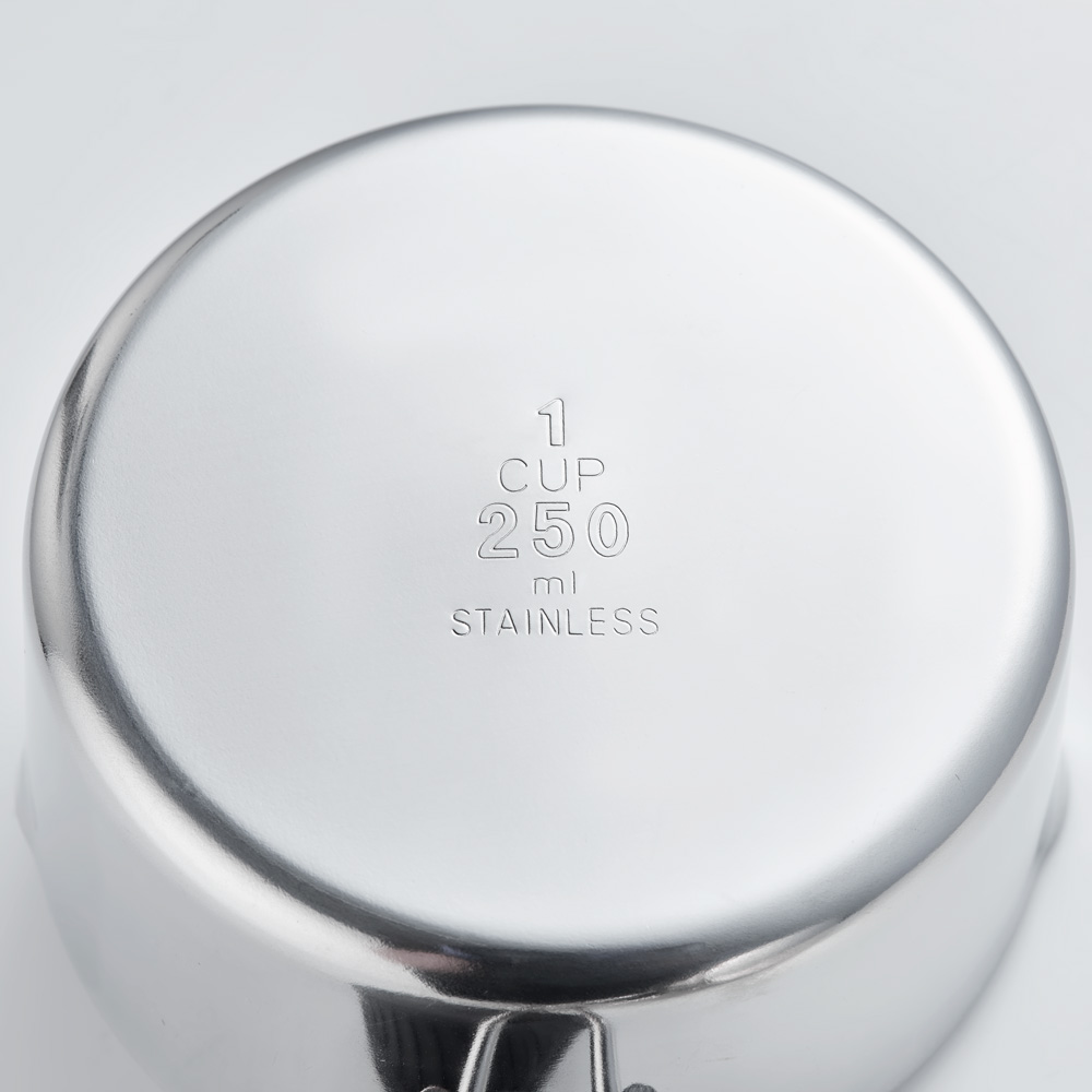 Das vierteilige Set ist zum schnellen Abmessen von kleinen Mengen flüssiger und trockener Zutaten geeignet. Die Löffel lassen sich beim Abmessen sicher hinstellen, da der Boden glatt ist. Auf der Bodenunterseite sind die Mengenangaben gut leserlich graviert. Kleine Ausgussnasen erleichtern Ihnen das Ausgießen von flüssigen Zutaten.