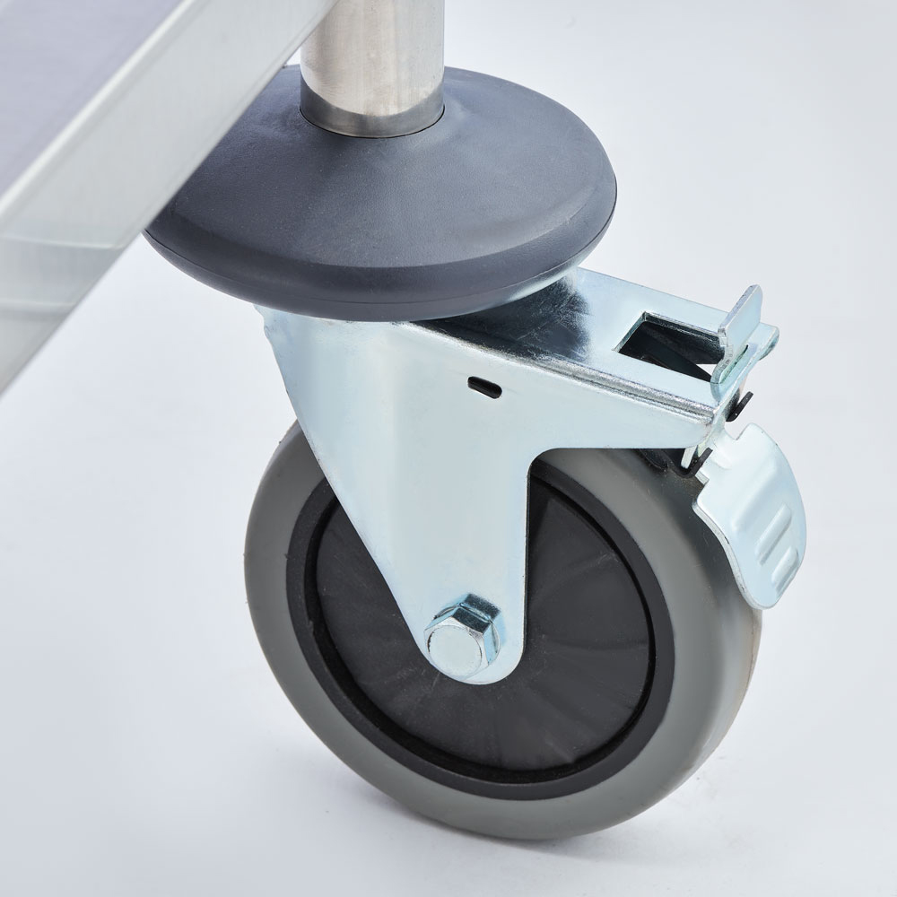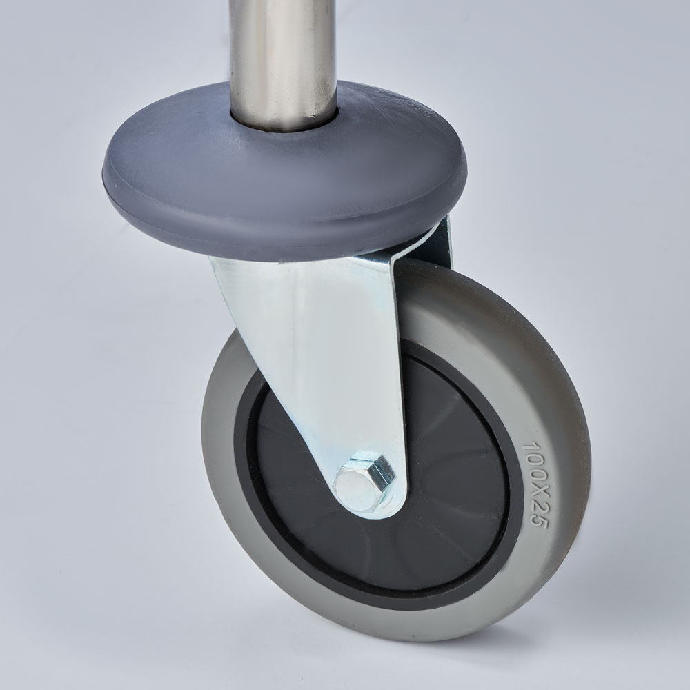 - vier leichtgängige Räder mit gummierter Lauffläche, zwei davon mit Feststellbremse