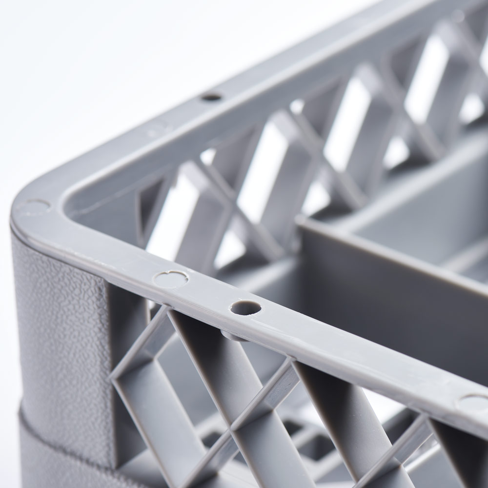 Dieser weitmaschige Spülkorb mit 25 Fächern ist konzipiert für die Reinigung von Gläsern und Tassen mit einem großen Durchmesser. Die durchdachte Bauweise lässt Wasser und Luft optimal zirkulieren für eine sorgfältige Reinigung und die perfekte Trocknung Ihres Spülguts! Griffmulden an jeder Seite unterstützen Sie im Arbeitsalltag. Mit dem käuflich erwerbbaren Aufsatzrand (GTIN 4062125027665) geben Sie höheren Gläsern den nötigen Halt. Der Spülkorb ist robust, langlebig, leicht und ohne scharfe Kanten sauber verarbeitet. Mit 500 x 500 mm ist der Korb passgenau für alle (Hauben-), Transportwagen, Tellerhalter, Besteck- und Besteckkörbe von Stalgast!