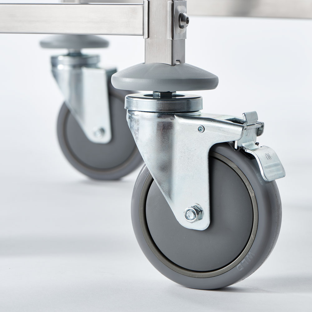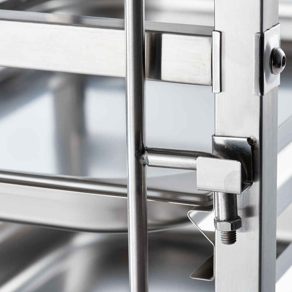 Vom Lager in die Küche und weiter zur Speisenausgabe, von der Abräumstation in die Spülküche…erledigen Sie alle Wege mühelos, indem Sie Ihre GN-Tabletts oder Behälter sicher mit dem Tablettwagen transportieren.Mit diesem Wagen können Sie bis zu 14 Behälter/Tabletts transportieren, ohne das etwas verrutscht oder herunterfällt. An beiden Einschubseiten sicheren schwenkbare Bügel aus Edelstahl Ihre Ladung. Los geht´s!