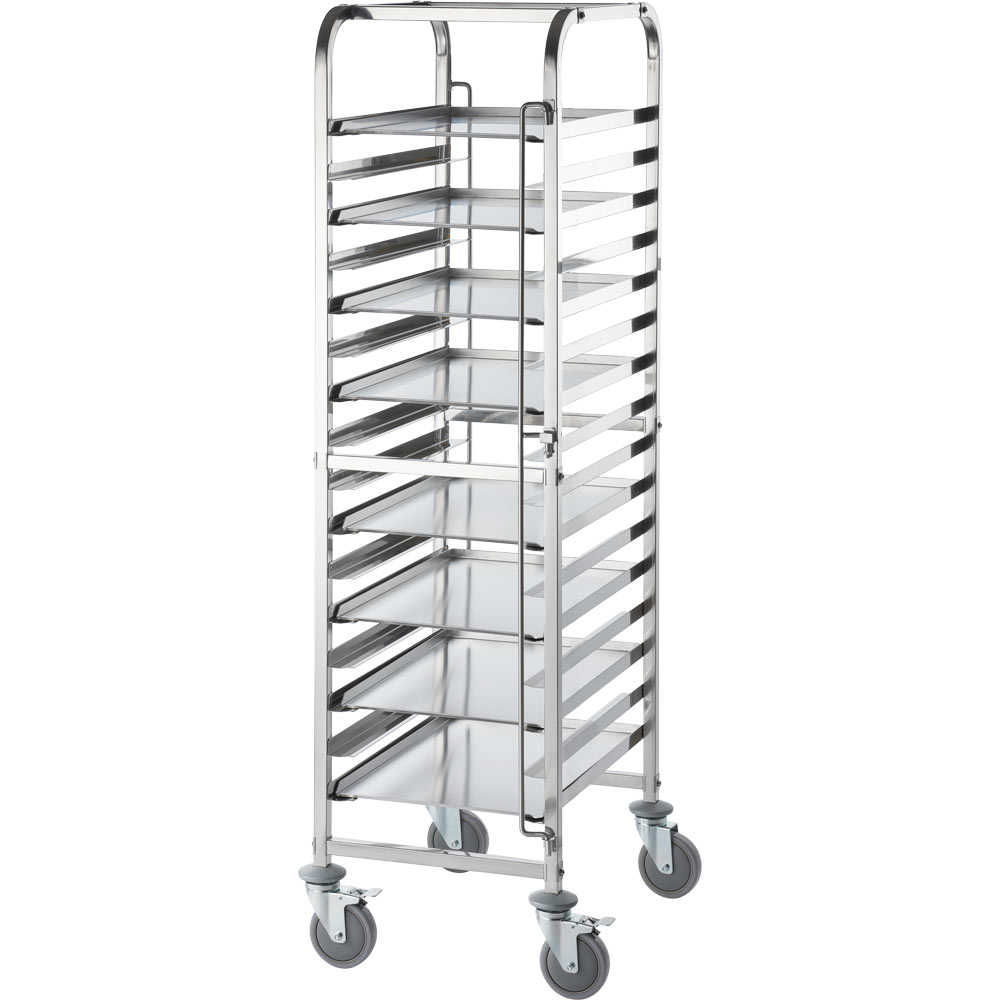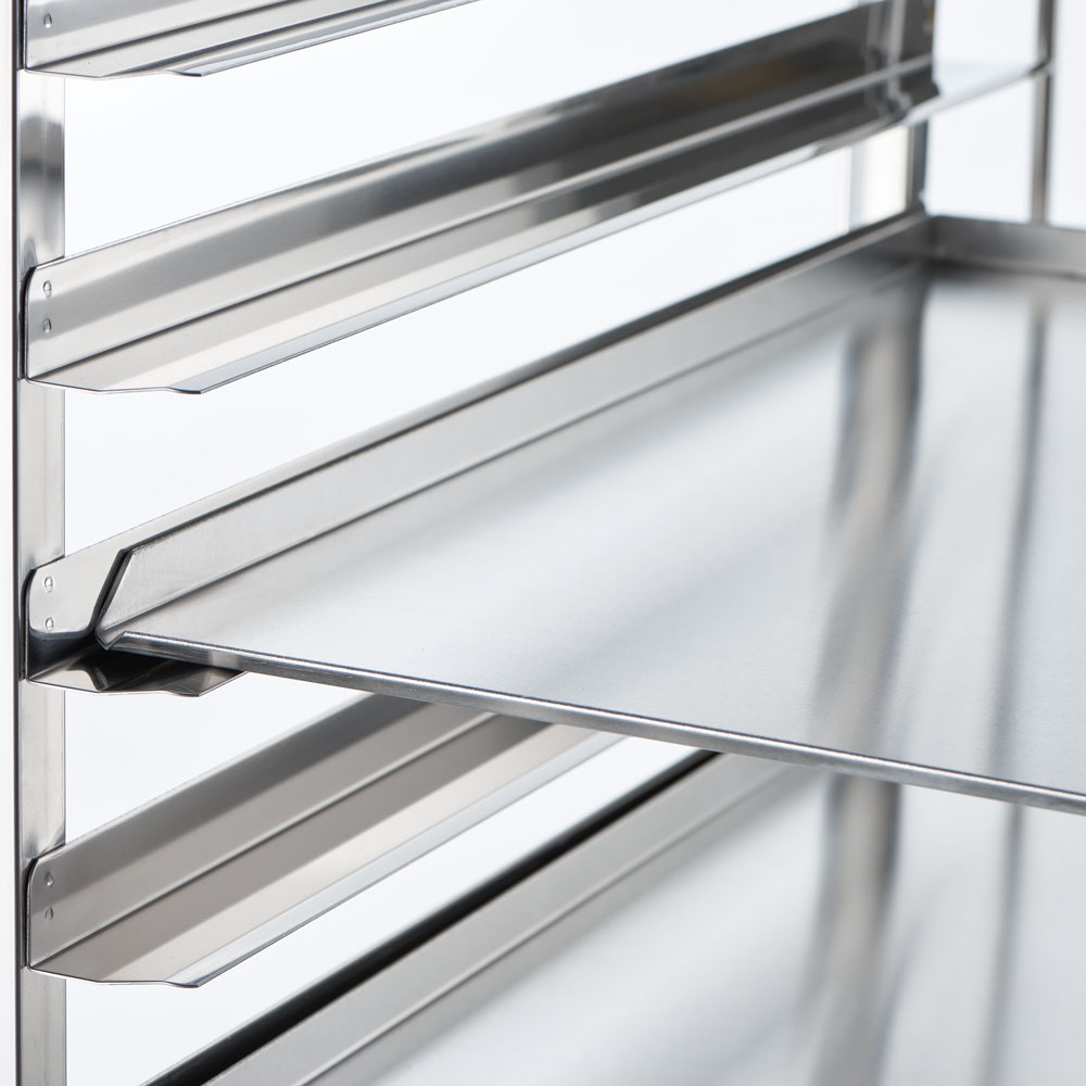Vom Lager in die Backstube und weiter in den Verkaufsraum…erledigen Sie alle Wege mühelos, indem Sie Ihre Backbleche sicher mit dem Tablettwagen transportieren.Mit diesem Wagen können Sie bis zu 16 Backbleche transportieren, ohne das etwas verrutscht oder herunterfällt. An beiden Einschubseiten sicheren schwenkbare Bügel aus Edelstahl Ihre Ladung. Los geht´s!