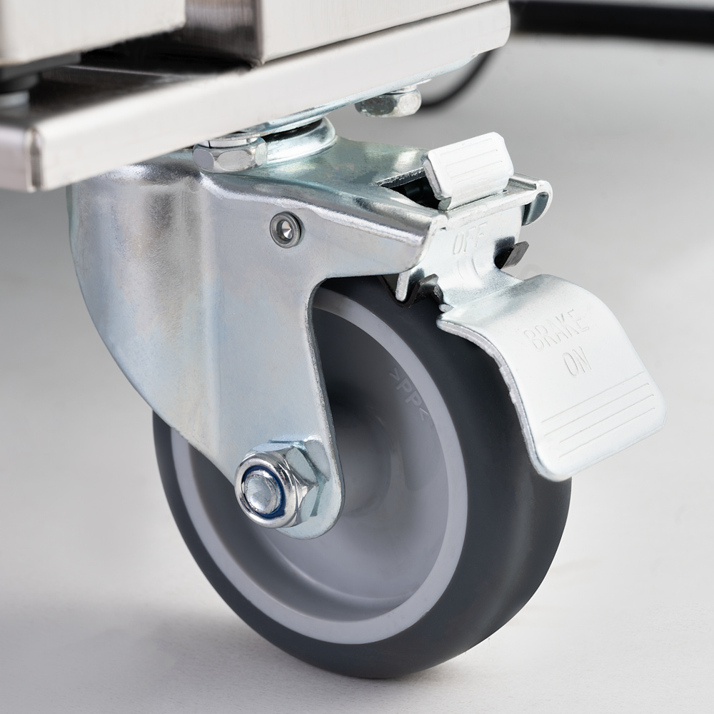 Dieser Lagerkühlschrank mit zuverlässiger Umluftkühlung ist ein professionelles Gerät mit solide verbauten, bewährten Komponenten.Das Gehäuse aus hochwertigem Edelstahl ist robust und erfüllt alle Arbeits- und Hygieneanforderungen. Idealerweise können Sie den Kühlschrank für die Reinigung und die Gerätewartung durch die Räder leicht verschieben.Im Lieferumfang sind drei Einlegeböden enthalten, die Sie je nach Anforderung 20fach in der Höhe verstellen können. Ergänzende Führungsschienen und Einlegeböden können Sie ebenfalls bei uns erwerben!Das Gerät punktet mit einer Abtauautomatik, automatischer Kondensatverdunstung, einer Innenbeleuchtung sowie einer durchgehenden Griffleiste zum Bedienen der Tür.