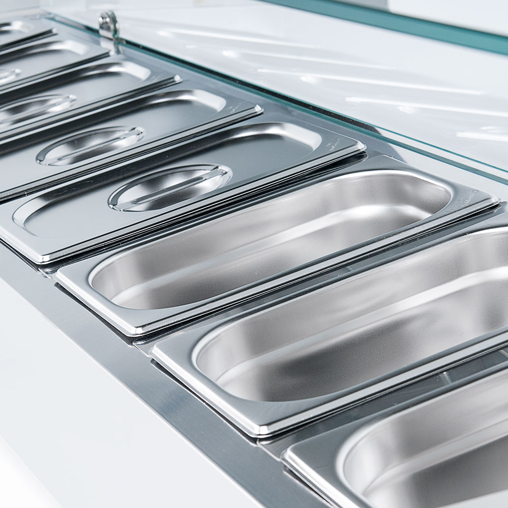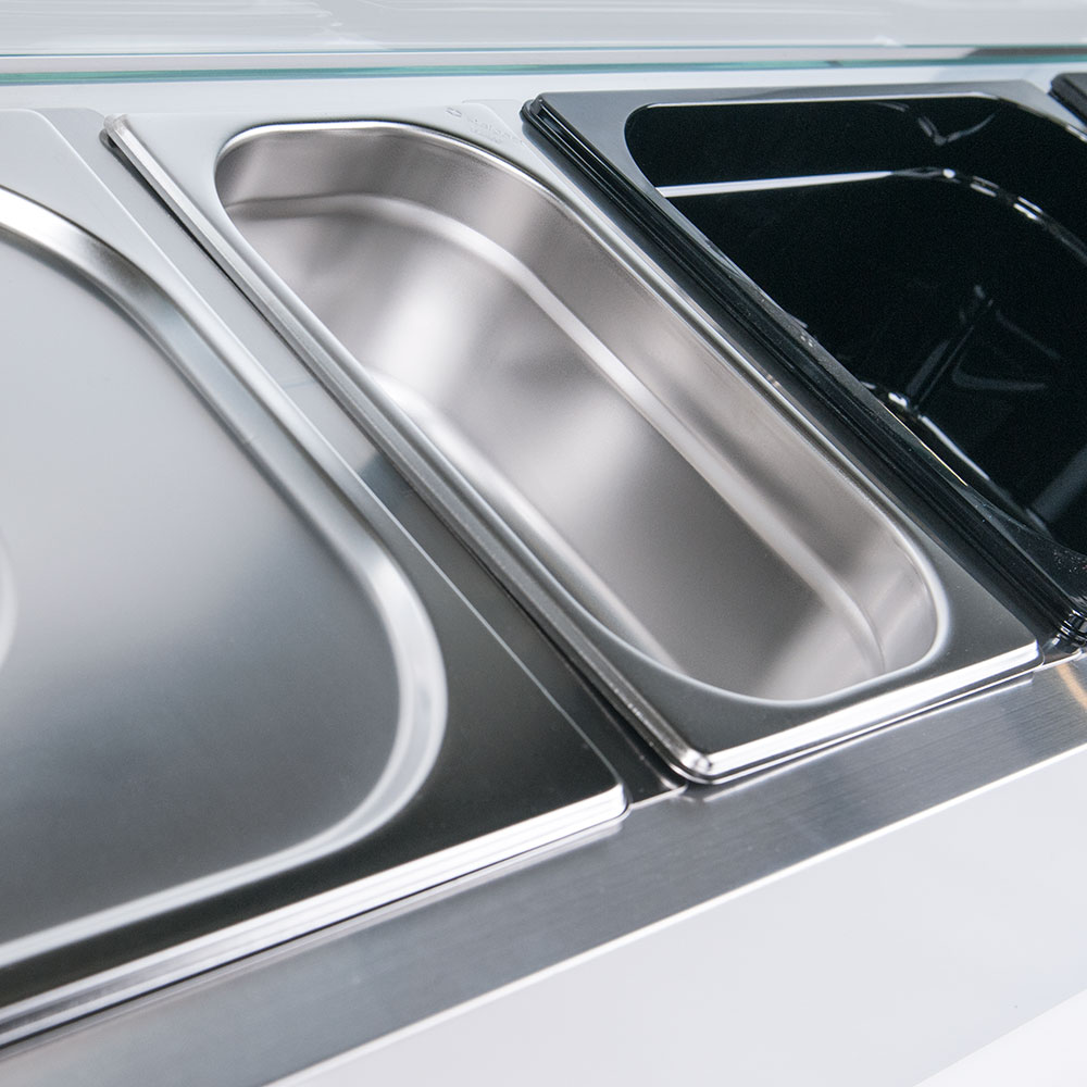 Bei geringen Raumbedarf können Sie in den Kühlaufsatz bis zu acht GN-Behälter einsetzen. Die Entnahme/das Befüllen der Behälter ist dank der Schrägstellung übersichtlich und einfach. Unterhalb der Behälter befindet sich die isolierte Kühlzone, deren Temperatur Sie in einem Bereich von +2/+8 °C manuell einstellen können. Über das Bedienelement mit Digitalanzeige kontrollieren Sie ebenso die Umgebungstemperatur und starten die Abtauung. Mit dem portablen Kühlaufsatz gestalten und erweitern Sie Ihren Arbeitsraum nach Ihren Wünschen. Das schlichte, zeitlose Design ermöglicht auch eine Aufstellung zur Präsentation der frischen Zutaten im Frontbereich Ihrer Gastronomie. Die Glasabdeckung dient hier als Spuckschutz und Ablage gleichermaßen. Dieser Kühlaufsatz ist ebenfalls für 4, 5 oder 6 GN 1/3 oder 1/4-Behälter erhältlich. Die GN-Behälter sind nicht im Lieferumfang enthalten! Die Serie Starline Ihres Gastronomie-Experten Stalgast überzeugt durch solide verbaute, bewährte Komponenten in Profi-Qualität zu günstigen Preisen! Die Serie Starline Ihres Gastronomie-Experten Stalgast überzeugt durch solide verbaute, bewährte Komponenten in Profi-Qualität zu günstigen Preisen!
