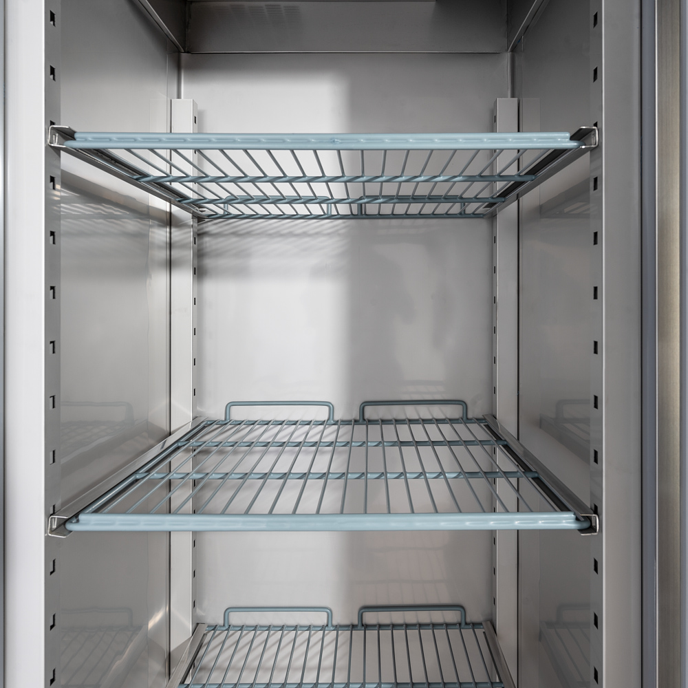 Dieser Lager-Tiefkühlschrank mit zuverlässiger Umluftkühlung ist ein professionelles Gerät mit solide verbauten, bewährten Komponenten. Das Gehäuse aus hochwertigem Edelstahl ist robust und erfüllt alle Arbeits- und Hygieneanforderungen. Idealerweise können Sie den Kühlschrank für die Reinigung und die Gerätewartung durch die Räder leicht verschieben. Im Lieferumfang sind drei Einlegeböden enthalten, die Sie je nach Anforderung 20fach in der Höhe verstellen können. Ergänzende Führungsschienen und Einlegeböden können Sie ebenfalls bei uns erwerben! Das Gerät punktet mit einer Abtauautomatik, automatischer Kondensatverdunstung, einer Innenbeleuchtung und einer durchgehenden Griffleiste zum Bedienen der Tür. Das Kühlaggregat und die manuelle Steuerung mit Digitalanzeige befinden sich auf komfortabler Höhe oberhalb der Tür. Die hilfreiche Außentemperaturanzeige unterstützt Sie bei der Temperaturwahl.