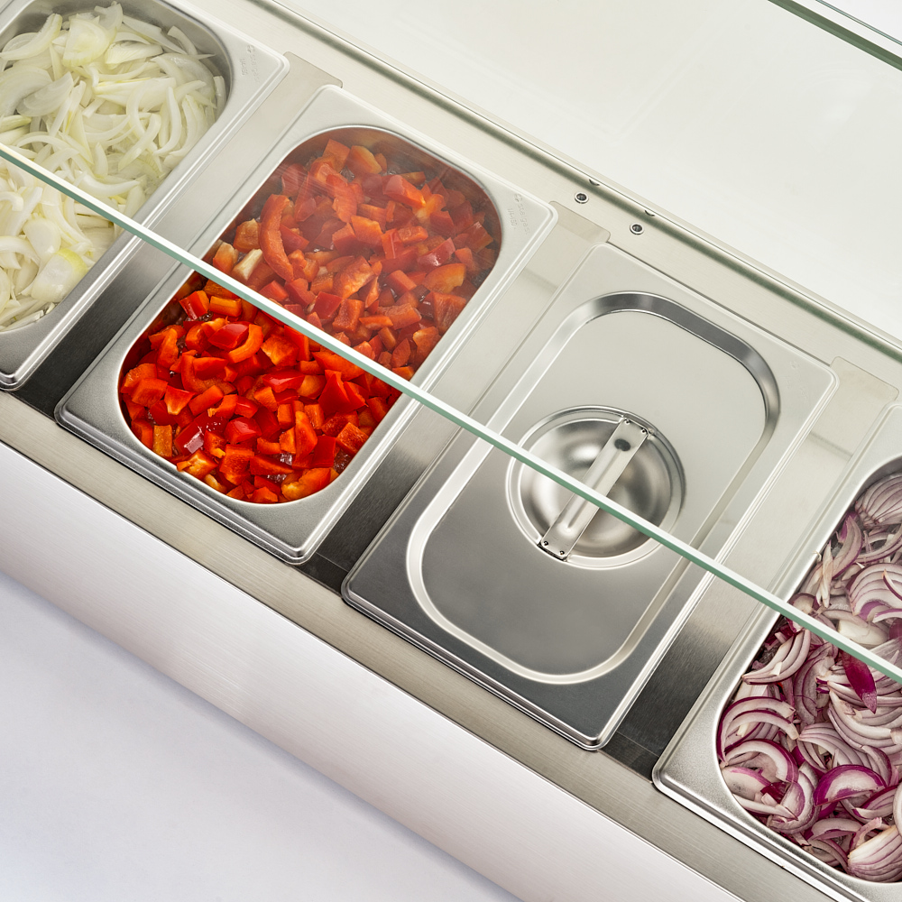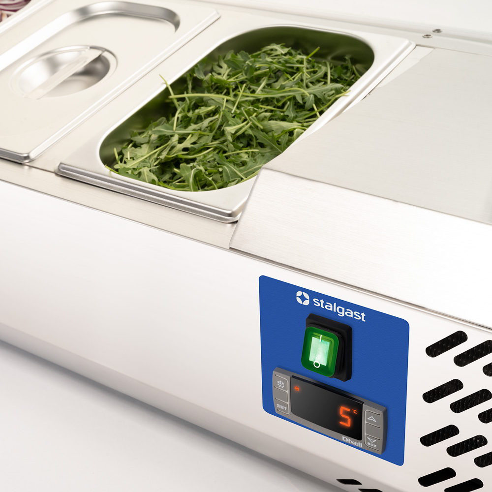 Bei geringen Raumbedarf können Sie in den Kühlaufsatz bis zu zehn GN-Behälter einsetzen. Die Entnahme/das Befüllen der Behälter ist dank der Schrägstellung übersichtlich und einfach.Unterhalb der Behälter befindet sich die isolierte Kühlzone, deren Temperatur Sie in einem Bereich von +2/+8 °C manuell einstellen können. Über das Bedienelement mit Digitalanzeige kontrollieren Sie ebenso die Umgebungstemperatur und starten die Abtauung.Mit dem portablen Kühlaufsatz gestalten und erweitern Sie Ihren Arbeitsraum nach Ihren Wünschen. Das schlichte, zeitlose Design ermöglicht auch eine Aufstellung zur Präsentation der frischen Zutaten im Frontbereich Ihrer Gastronomie. Die Glasabdeckung dient hier als Spuckschutz und Ablage gleichermaßen.Dieser Kühlaufsatz ist ebenfalls für 4, 5, 7 oder 8 GN 1/3 oder 1/4-Behälter erhältlich.Die GN-Behälter sind nicht im Lieferumfang enthalten!Die Serie Starline Ihres Gastronomie-Experten Stalgast überzeugt durch solide verbaute, bewährte Komponenten in Profi-Qualität zu günstigen Preisen!