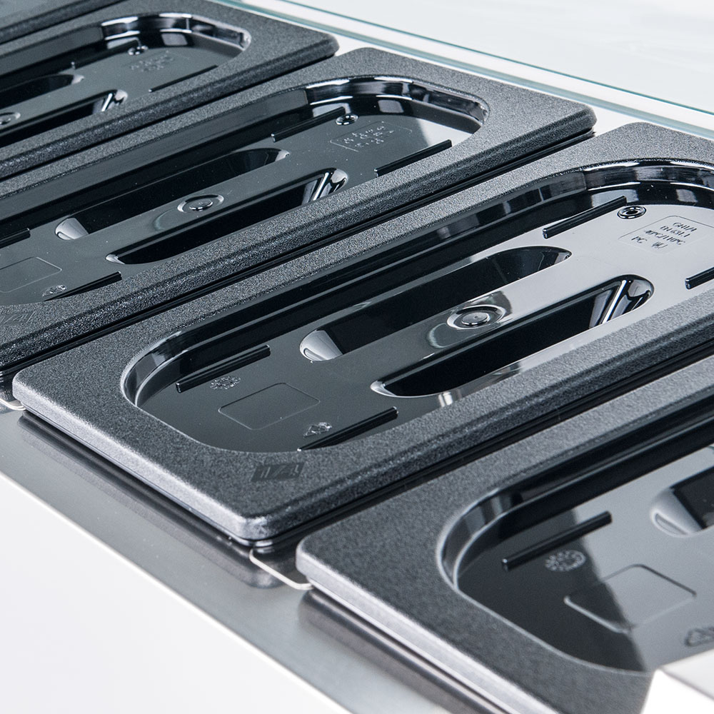 Bei geringen Raumbedarf können Sie in den Kühlaufsatz bis zu fünf GN-Behälter einsetzen. Die Entnahme/das Befüllen der Behälter ist dank der Schrägstellung übersichtlich und einfach. Unterhalb der Behälter befindet sich die isolierte Kühlzone, deren Temperatur Sie in einem Bereich von +2/+8 °C manuell einstellen können. Über das Bedienelement mit Digitalanzeige kontrollieren Sie ebenso die Umgebungstemperatur und starten die Abtauung. Mit dem portablen Kühlaufsatz gestalten und erweitern Sie Ihren Arbeitsraum nach Ihren Wünschen. Das schlichte, zeitlose Design ermöglicht auch eine Aufstellung zur Präsentation der frischen Zutaten im Frontbereich Ihrer Gastronomie. Die Glasabdeckung dient hier als Spuckschutz und Ablage gleichermaßen. Dieser Kühlaufsatz ist ebenfalls für 4, 6 oder 8 GN-Behälter erhältlich. Die GN-Behälter sind nicht im Lieferumfang enthalten! Die Serie Starline Ihres Gastronomie-Experten Stalgast überzeugt durch solide verbaute, bewährte Komponenten in Profi-Qualität zu günstigen Preisen!