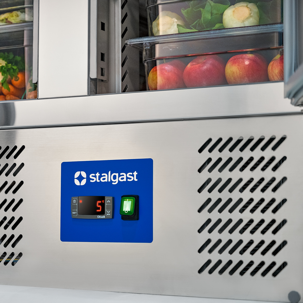 Optimaler Pizzatisch für die Grundausstattung Ihres gastronomischen Betriebes. Die Arbeitsfläche aus unverwüstlichem Granit ist kratz- und schnittfest sowie geschmacksneutral. Ihre vorbereiteten Zutaten lagern Sie griffbereit in den fünf schräggestellten GN 1/6-Behältern. Weiteren Stauraum bieten Ihnen die zwei Kühlfächer aus Edelstahl mit je einem GN 1/1 Einlegeboden. Die isolierten, selbstschließenden Türen lassen sich Mithilfe der durchgehenden Griffleiste einfach öffnen und schließen. Die Kühltemperatur können Sie in einem Bereich von +2/+8 °C manuell einstellen. Über das Bedienelement mit Digitalanzeige kontrollieren Sie ebenso die Umgebungstemperatur und starten die Abtauung. Das schlichte, zeitlose Design und die Verarbeitung von hochwertigem Edelstahl ermöglicht eine Aufstellung im Frontbereich Ihrer Gastronomie. Die Abdeckung dient hier als Spuckschutz und Ablage gleichermaßen. Die GN-Behälter sind nicht im Lieferumfang enthalten! Die Serie Starline Ihres Gastronomie-Experten Stalgast überzeugt durch solide verbaute, bewährte Komponenten in Profi-Qualität zu günstigen Preisen!