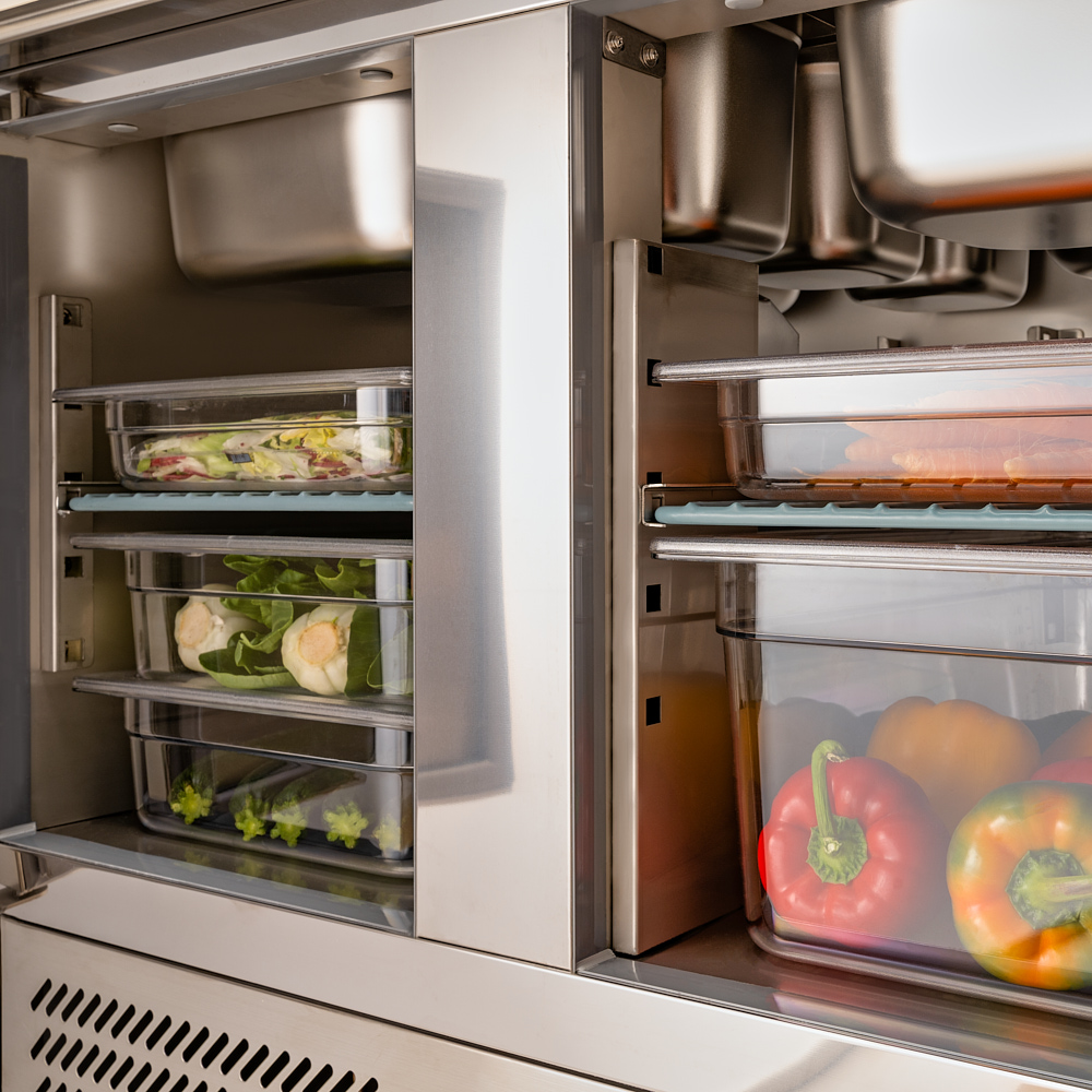 Mit Platz für 10x GN 1/4-Behälter und einem praktischem Schneidebrett bietet Ihnen dieser Vorbereitungstisch viel Arbeitsfläche und Einsatzmöglichkeiten auf kompaktem Raum! Das Gehäuse ist aus hochwertigem, pflegeleichtem Edelstahl gefertigt. Die zwei isolierten, selbstschließenden Türen lassen sich Mithilfe der durchgehenden Griffleiste einfach öffnen und schließen. Im Innenraum erwarten Sie zwei höhenverstellbare Einlegeroste in vorteilhafter Größe von GN 1/1! Auf der Oberseite verbirgt sich unter dem zur Hälfte einschiebbaren Deckel die Aufbewahrungsmöglichkeit für max. 10x GN 1/4-Behälter. Im vorderen Drittel steht Ihnen ein Schneidebrett aus weißem Polyethylen für die Zubereitung und das Anrichten Ihrer Speisen zur Verfügung! Die Kühltemperatur können Sie in einem Bereich von +2/+8 °C manuell einstellen. Über das Bedienelement mit Digitalanzeige kontrollieren Sie ebenso die Umgebungstemperatur und starten die Abtauung. Die GN-Behälter sind nicht im Lieferumfang enthalten! Die Serie Starline Ihres Gastronomie-Experten Stalgast überzeugt durch solide verbaute, bewährte Komponenten in Profi-Qualität zu günstigen Preisen!