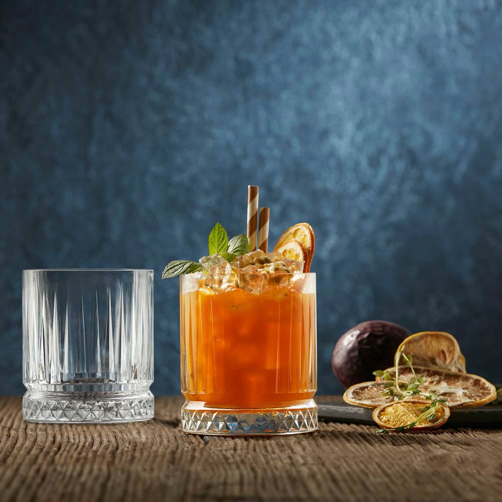 Das Trinkglas der Serie Elysia ist das ideale Glas für gehobene Ansprüche.Der abgesetzte, massive Stand ist umzogen von einem dekorativen, reliefierten Steineldekor. Der Bleikristallglas-Charakter wird auf der Wandung fortgeführt. Schlanke, schmal zulaufende Rillen sorgen für eine lebhafte Lichtbrechung und setzen Ihre Getränke optimal in Szene.Servieren Sie Soft- oder Shortdrinks in diesem Tumbler von max. 210 ml Inhalt aus der geschmackvollen Serie Elysia. Für das einfache Handling können Sie das Glas in der Spülmaschine reinigen und einfach polieren.