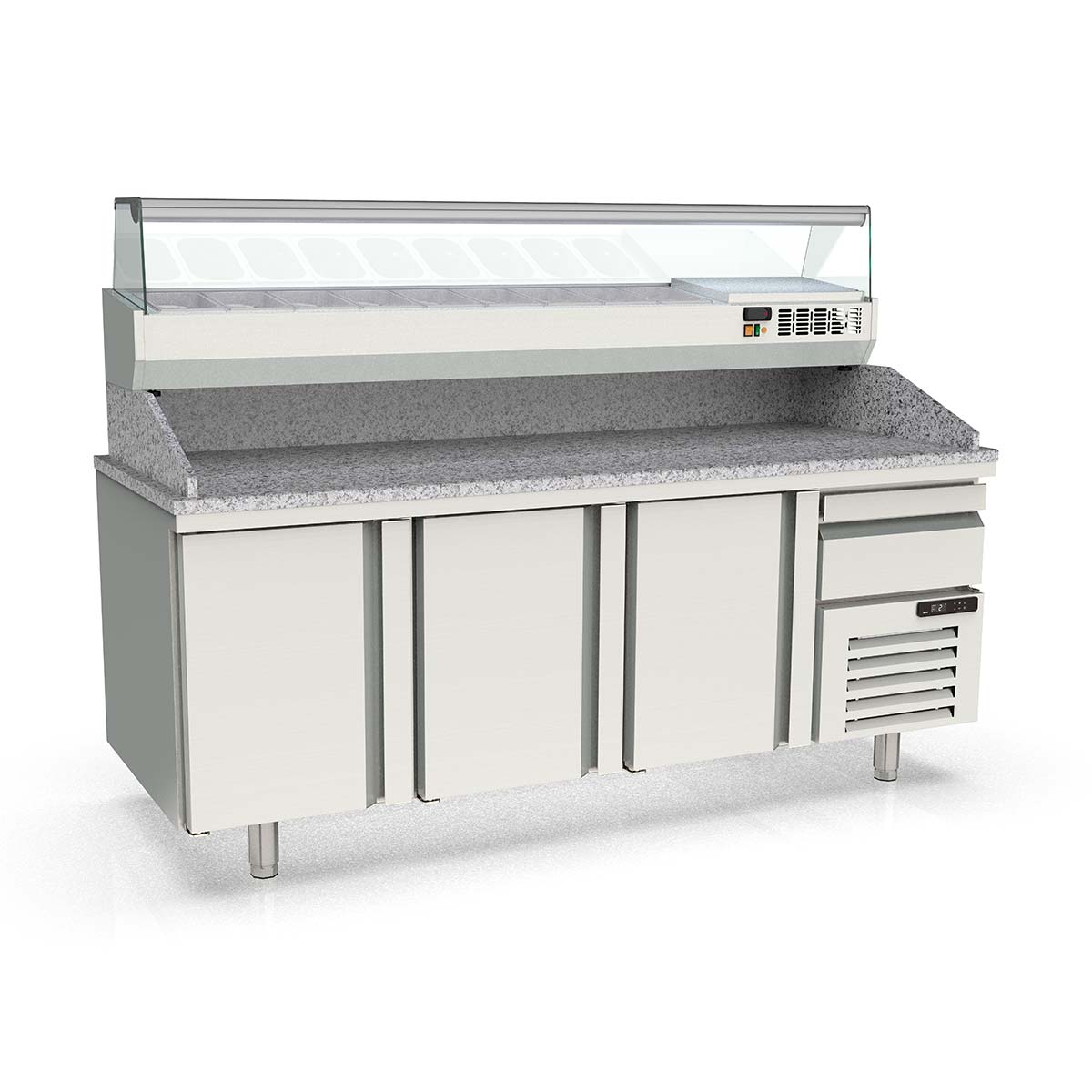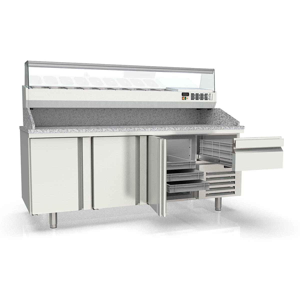 Vaiotec Topline Pizzatisch / 3-fach mit Türen, EN 60x40, Schublade, Granitplatte grau, inkl. Kühlaufsatz, GN 1/4, 2090 x 800 mm