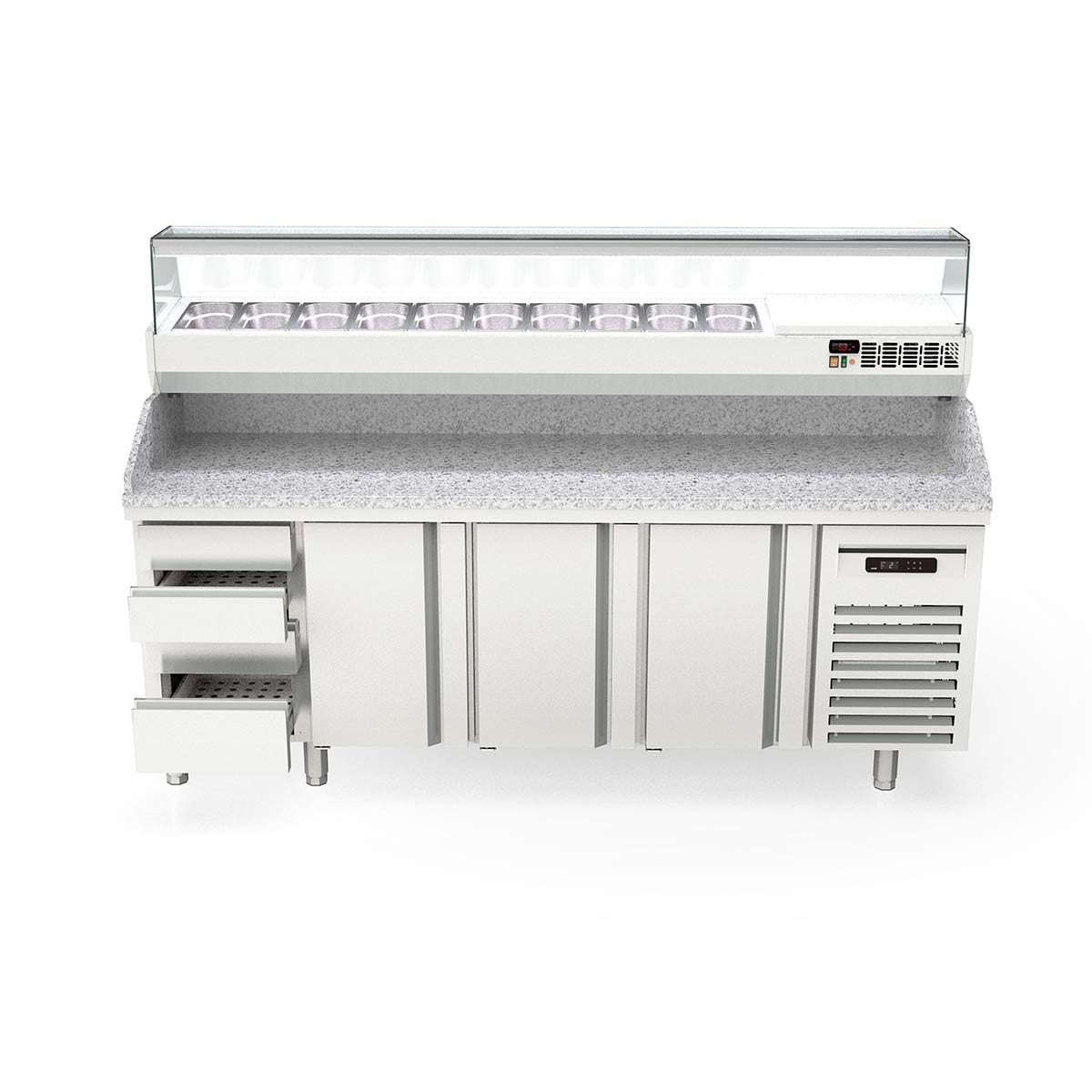 Vaiotec Topline Pizzatisch / 4-fach mit 3 Türen, Schubladenblock, Granitplatte grau, inkl. Kühlaufsatz, GN 1/4, 2245 x 700 mm