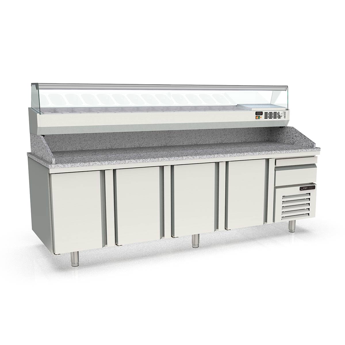 Vaiotec Topline Pizzatisch / 4-fach mit Türen, EN 60x40, Schublade, Granitplatte grau, inkl. Kühlaufsatz, GN 1/4, 2615 x 800 mm