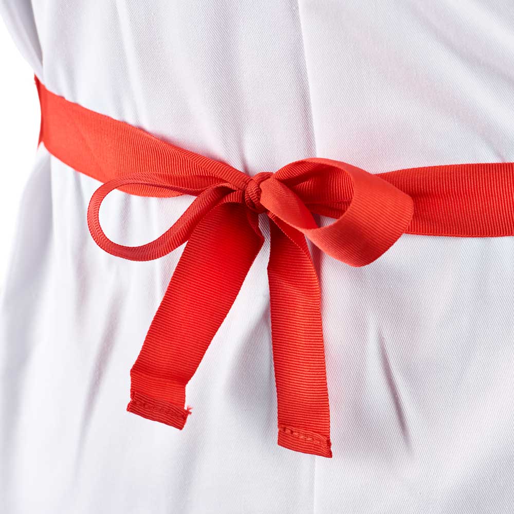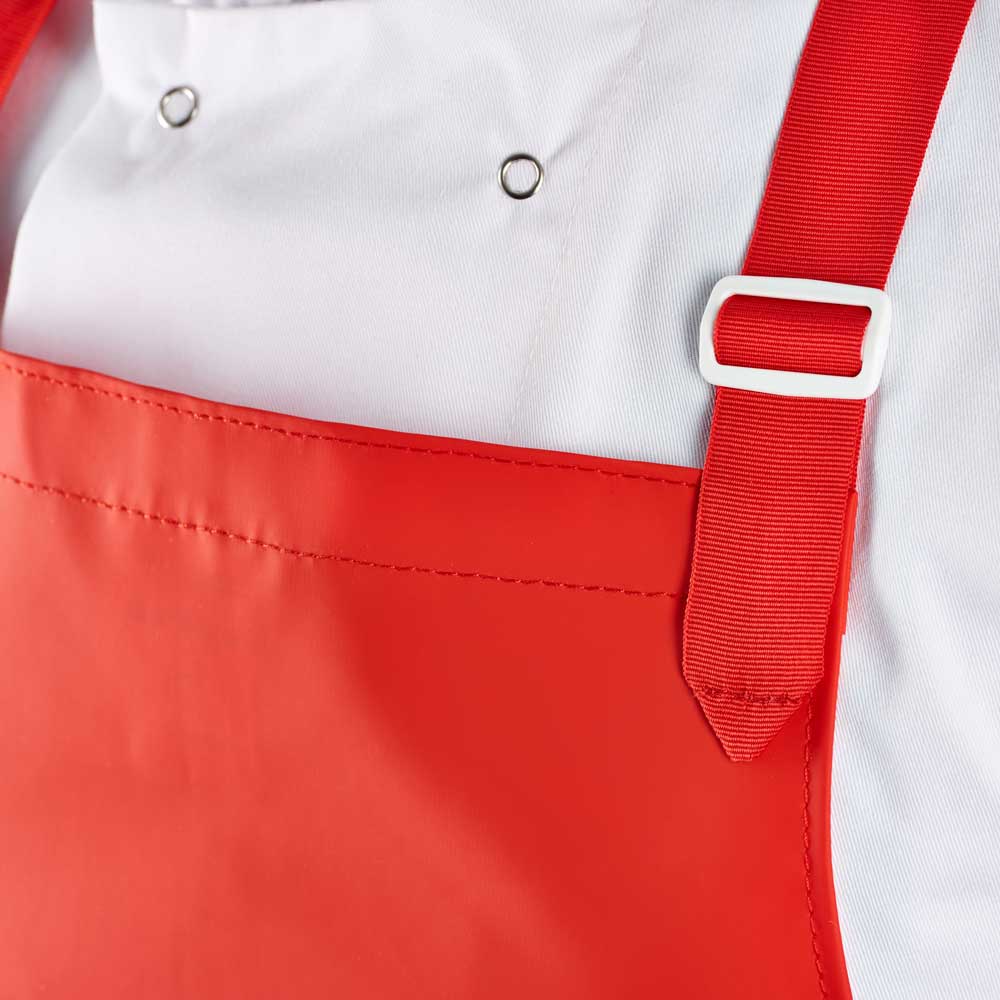 Die mit PVC beschichtete Schürze ist widerstandsfähig gegen Wasser, Fette und Desinfektionsmittel. Die Schürze ist reißfest und der Tragekomfort wird durch das geringe Gewicht und das verstellbare Nackenband erhöht.