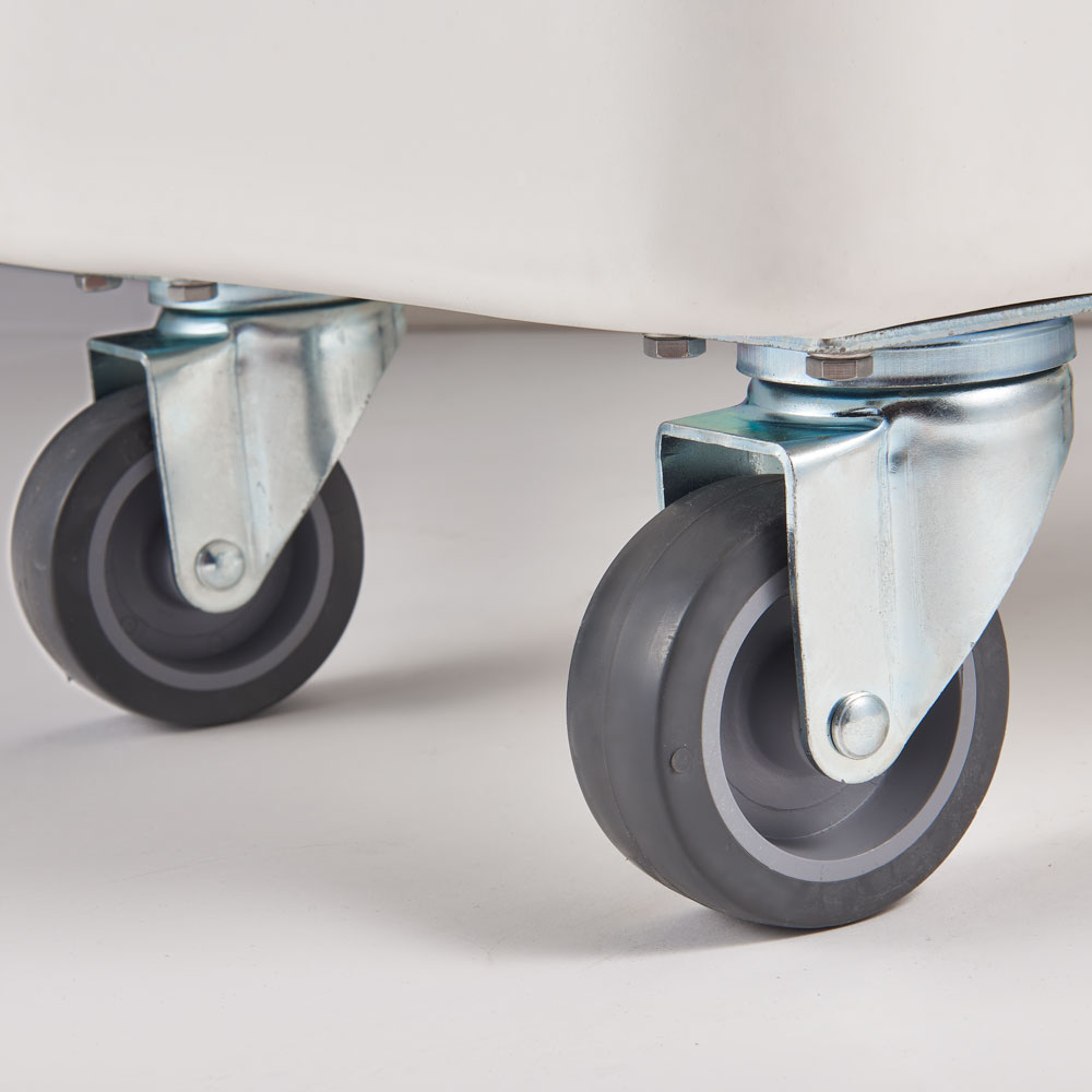 Damit Sie leicht an Ihre trockenen Zutaten gelangen, verfügt der zweigeteilte Deckel über eine große Öffnung mit Sichtfenster. Mit einer Höhe von 715 mm passt der Behälter griffbereit unter Ihre Arbeitsplatte.In diesen Vorratsbehälter passen z.B. 56 kg Mehl oder 73 kg Zucker. Ganz schön viel Gewicht! Deshalb steht der Behälter auf vier stabilen Rollen, damit Sie ihn leicht transportieren oder bei der Bodenreinigung verschieben zu können.Apropos Reinigung: der Behälter hat gerundete Kanten und glatte Oberflächen, um schnell und tadellos gereinigt zu werden.